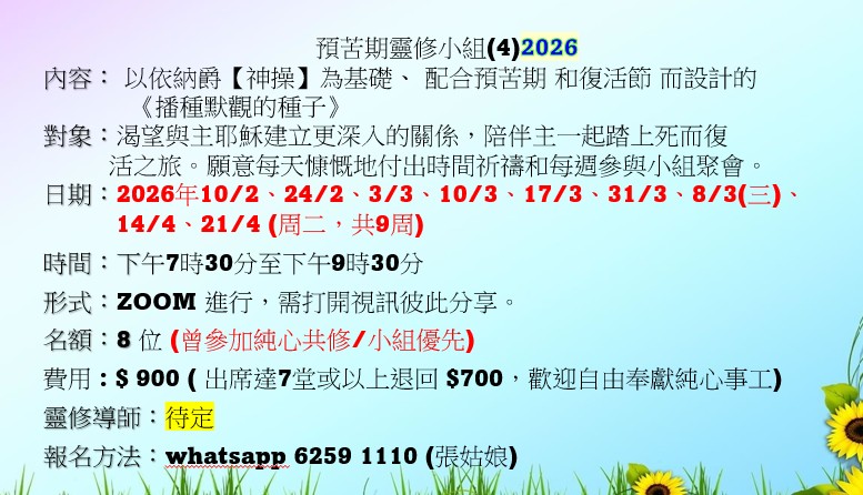 內容: 以依納爵【神操】為基礎、 配合預苦期 和復活節 而設計的