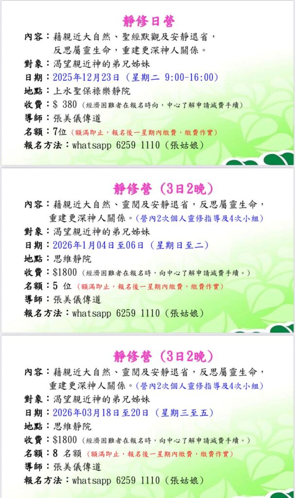內容:藉親近大自然、聖經默觀及安靜退省,反思屬靈生命,重建更深神人關係。